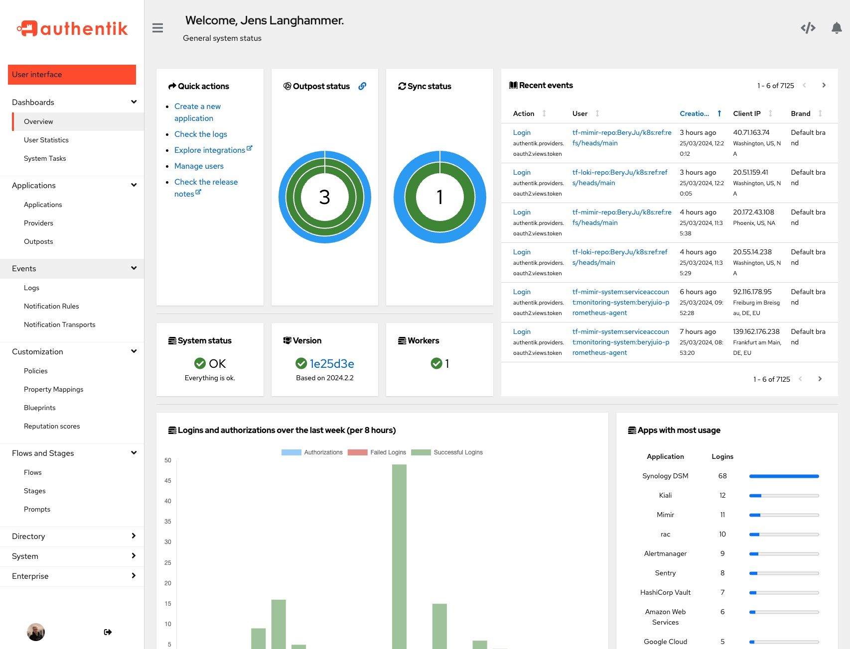Flow interface: Flows are the steps by which the various Stages of a login and authentication process occurs. A stage represents a single verification or logic step in the sign-on process. authentik allows for the customization and exact definition of these flows.